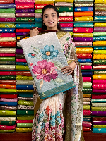 Soft Kora Silk Floral Digital Print Half White With Rama Green Saree