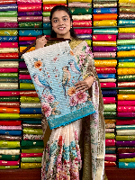 Soft Kora Silk Floral Digital Print Half White With Sky Blue Saree