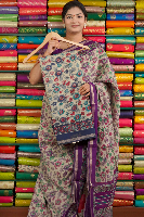 Soft Maheswari Silk Allover Floral Beige With Navy Blue Saree