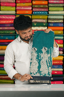 Soft Maheswari Silk Kalamkari Print Rama Green With Peacock Blue Saree