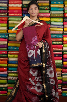 Soft Mangalagiri Digital Lotus Print Wine And NavyBlue Saree