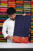 Soft Munga Crepe Silk Gold Zari Flower Butti Dark Navy Blue With Red Saree
