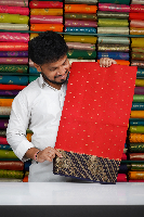 Soft Munga Crepe Silk Gold Zari Flower Butti Red With Bright Navy Blue Saree