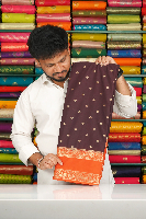 Soft Mysore Crepe Silk Flower Butti Gap Border Chocolate Brown With Rust Orange Saree