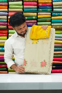 Soft Rangoli Silk Embroidary Work Cream With Yellow Saree