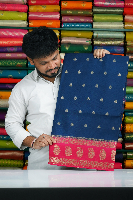 Soft Russian Crepe Silk Gold Zari Leaf Butti Bright Peacock Blue With Pink Saree