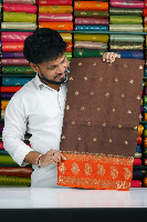 Soft Russian Crepe Silk Gold Zari Leaf Butti Chocolate Brown With Rust Orange Saree