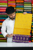 Soft Russian Crepe Silk Gold Zari Leaf Butti Dark Mustard Yellow With Purple Saree