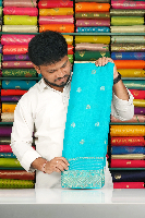 Soft Russian Crepe Silk Silver And Gold Zari Flower Bunch Light Blue With Dark Navy Blue Saree