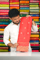 Soft Russian Crepe Silk Silver And Gold Zari Flower Bunch Peach With Red Saree