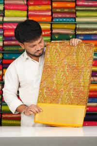 Soft Semi Dola Silk All Over Print Zari Brocade Border Mustard Yellow Saree