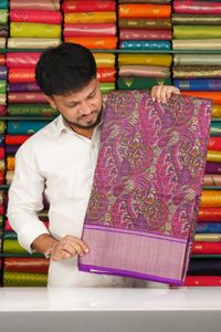 Soft Semi Dola Silk All Over Print Zari Brocade Border Purple Saree