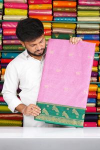 Soft Semi Mysore Crepe Silk Checks Peacock Butti Baby Pink With Dark Green Saree