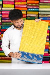 Soft Semi Mysore Crepe Silk Checks Peacock Butti Yellow With Peacock Blue Saree