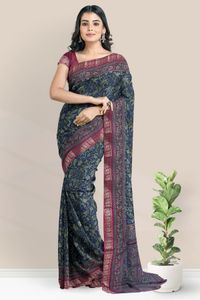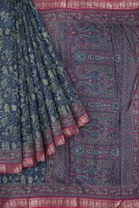Soft Silk Floral Print Dark Navy Blue With Pink Saree