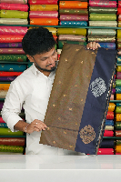 Soft Silk Gold Zari Flower Butti Grayish Brown With Dark Navy Blue Saree