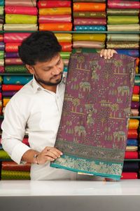 Soft Silk Kalamkari Print Kanchi Border Light Brinjal With Rama Green Saree