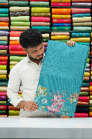 Soft Silk Kota Floral Printed With Mirror Work Bora Design Sea Blue Saree