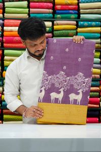 Soft Silk Printed Pattern And Deer Design Dark Levander With Mustard Yellow Saree