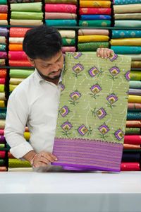 Soft Silk Printed Pattern And Doriya Weaving Line Green With Purple Saree
