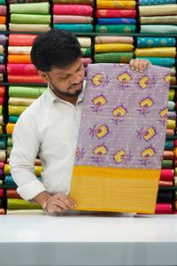 Soft Silk Printed Pattern And Doriya Weaving Line Levander With Mustard Yellow Saree