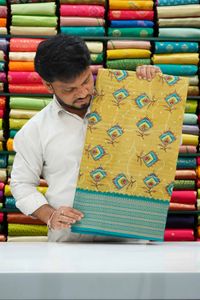 Soft Silk Printed Pattern And Doriya Weaving Line Yellow With Rama Green Saree