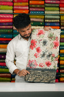 Soft Tussar Silk Checks Floral Digital Print Cream With Ash Saree