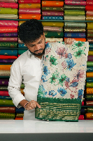 Soft Tussar Silk Checks Floral Digital Print Cream With Dark Green Saree