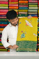 Super Georgette Checks With Zari Brocade Border Dark Mustard Yellow With Green Saree
