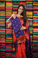 Tussur Silk Parrot Design Navy Blue And Brick Red Saree