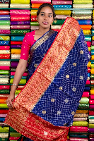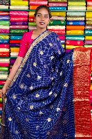 Vintage Mashru Silk Gold Zari Checks And Butti Navy Blue With Red Saree