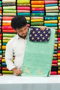 Viscose Georgette Meenakari Peacock Butti Teal Green With Navy Blue Saree